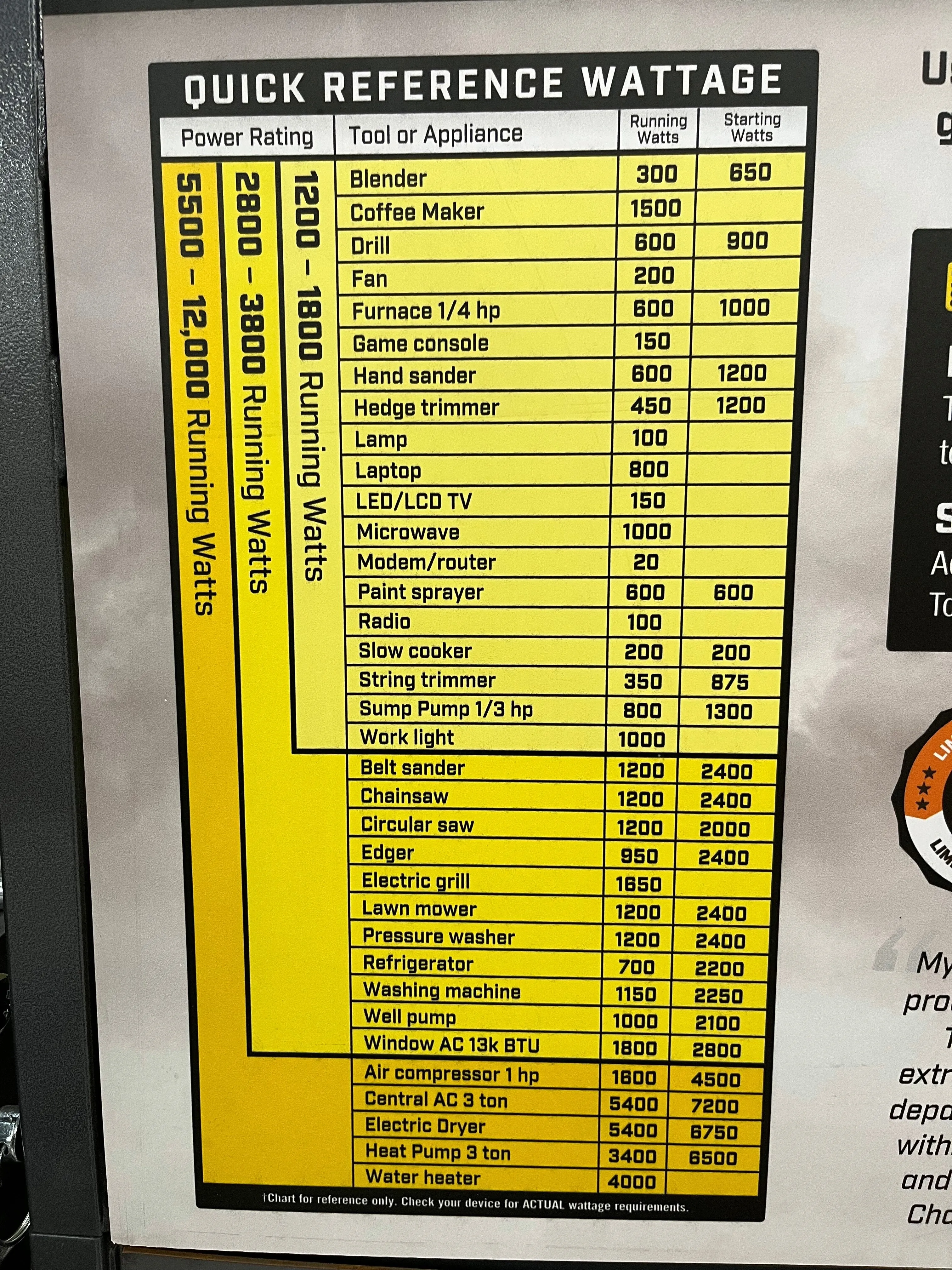 • Gas Running watts 3,800